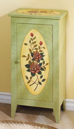 Bring understated elegance to your storage needs with this antique-finished corner cabinet delicately painted in soft pastels and paneled with a graceful Victorian rose. 3 shelves. Wood. 16” x 9 1/2” x 30 1/2” high.